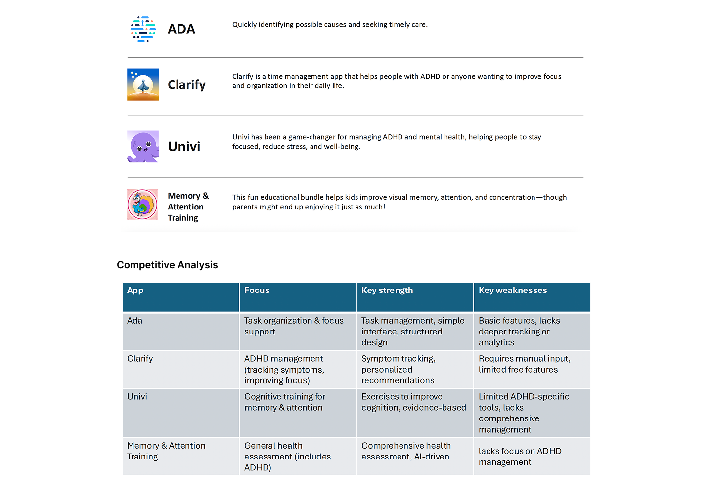 Many existing ADHD applications offer only basic features and fail to adapt to user behavior. They are often too complex for parents in rural areas and create language barriers that limit accessibility. Some apps rely on deep tracking methods that can overwhelm patients and cause both children and parents to lose interest.
